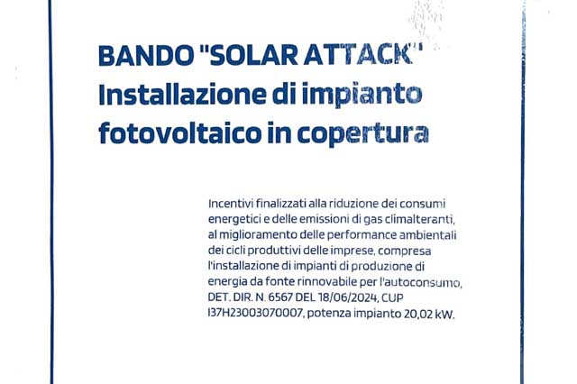 Il locale ha beneficiato del Bando Solar Attack per l'installazione di impianto fotovoltico in copertura (DET. DIR. N. 6567 del 18/06/2024, CUP I37h2300307000t, potenza 20,02 kW) mirato alla riduzione dei consumi energetici e delle emissioni di gas climalteranti e al miglioramento delle performance ambientali dei cicli produttivi.
